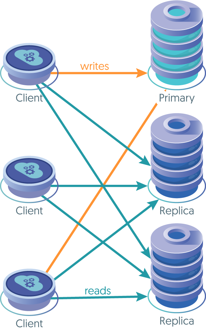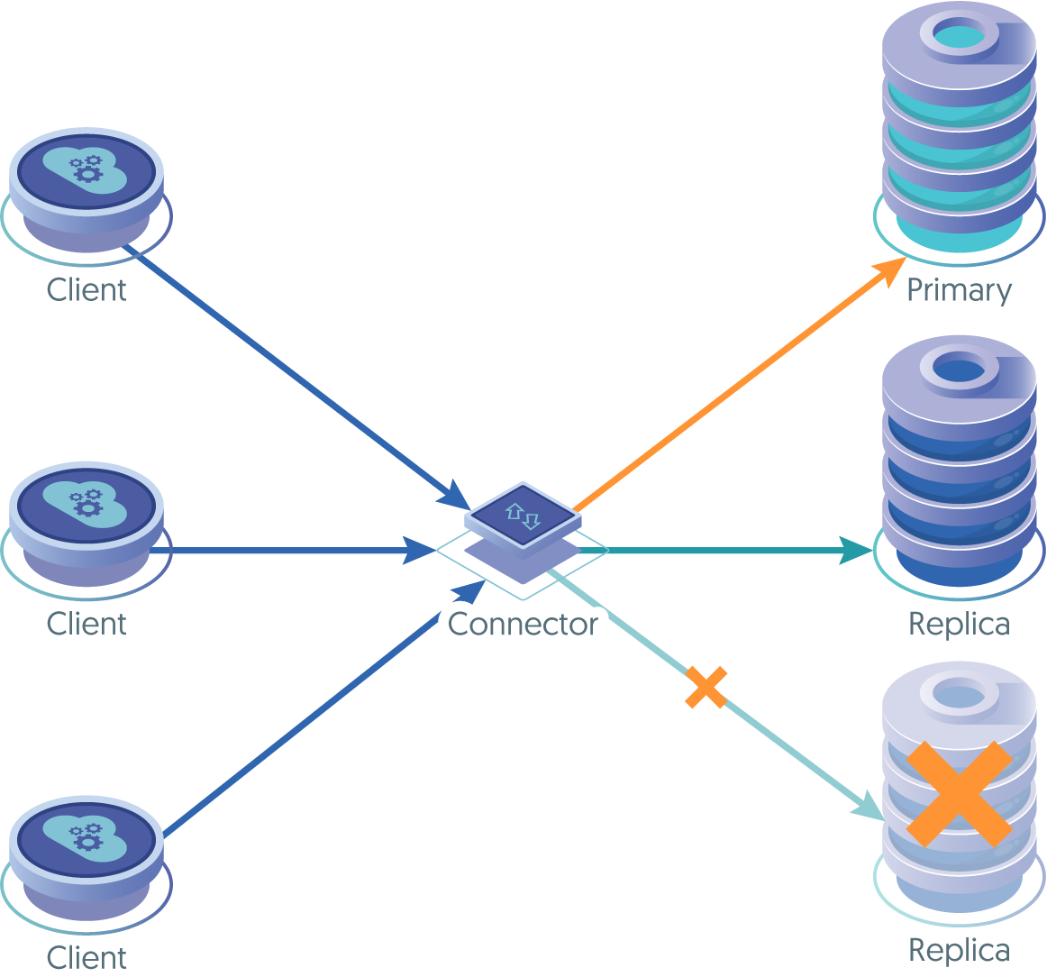 Although this handles the read/write splitting, enabling servers to write to the Primary and read from one or more Replicas, changes to this architecture and structure are not handled. If the Primary fails, application servers must be manually updated to direct their queries to an alternative host.
