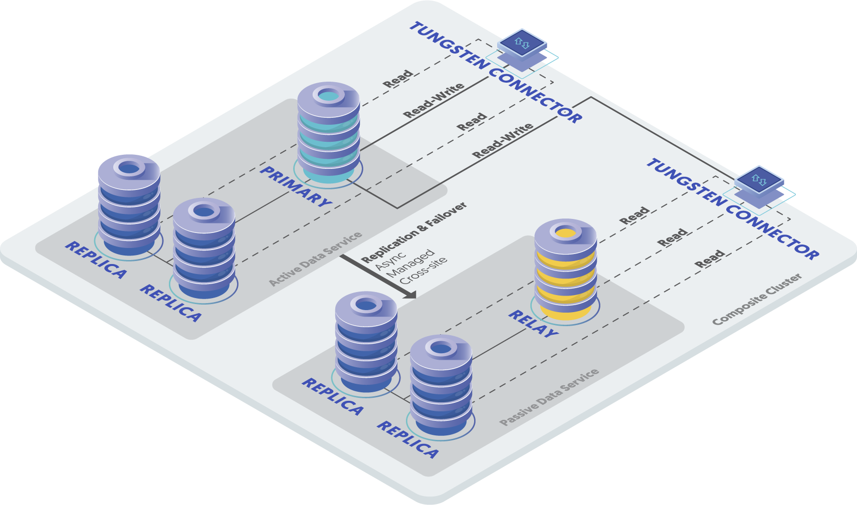 Tungsten Cluster supports the creation of composite clusters. This includes multiple active/passive dataservices tied together. One of the dataservices is identified as the active, containing the Primary node and all other dataservices (passive) replicate from it.