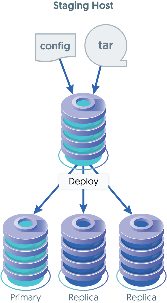 To use a staging host, you will need to configure SSH on each machine within the topology which allows the tpm tool to connect and perform the necessary installation and setup operations to create your environment, as shown in Figure B.1, “Tungsten Deployment”.
