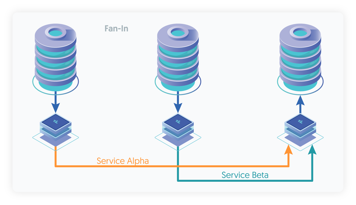 The fan-in topology is the logical opposite of a fan-out topology. In a fan-in topology, the data from two (or more) Sources is combined together on one Target. Fan-in topologies are often used in situations where you have satellite databases, maybe for sales or retail operations, and need to combine that information together in a single database for processing.